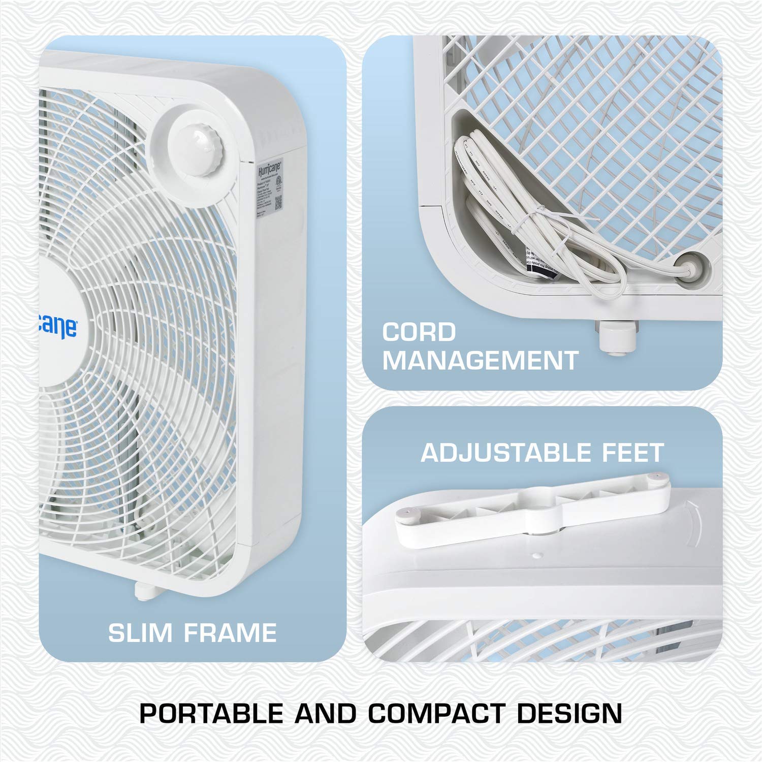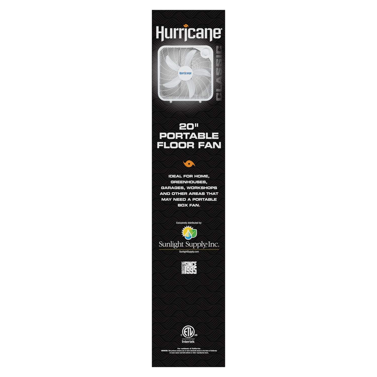 For a cool breeze and steady flow of air you can control—anywhere you need them— turn to the Hurricane® Classic 20 inch Portable Floor Fan. With its compact, space-saving design, this fan is ideal for your home, whether in the office, basement or bedroom, and other areas that require reliable airflow like greenhouses, gyms, garage and workshops. Hurricane’s quiet, yet powerful 3 motor generates a cooling breeze in both large and small areas. Offering 3 speed settings, it’s the perfect box fan for creating a basic indoor breeze or helping to ventilate stagnant air or fumes from your space. Durably constructed, with light-weight polymer blades. Its slim frame, adjustable feet, and power cord-tucking compartment make it easy to store when not in use. This versatile fan runs at 2400 CFM and 1100 RPM. Comes with a 5 ft. 120 volt power cord. Measures 20 in. x 20 in. x 3.5 in. ETL listed.