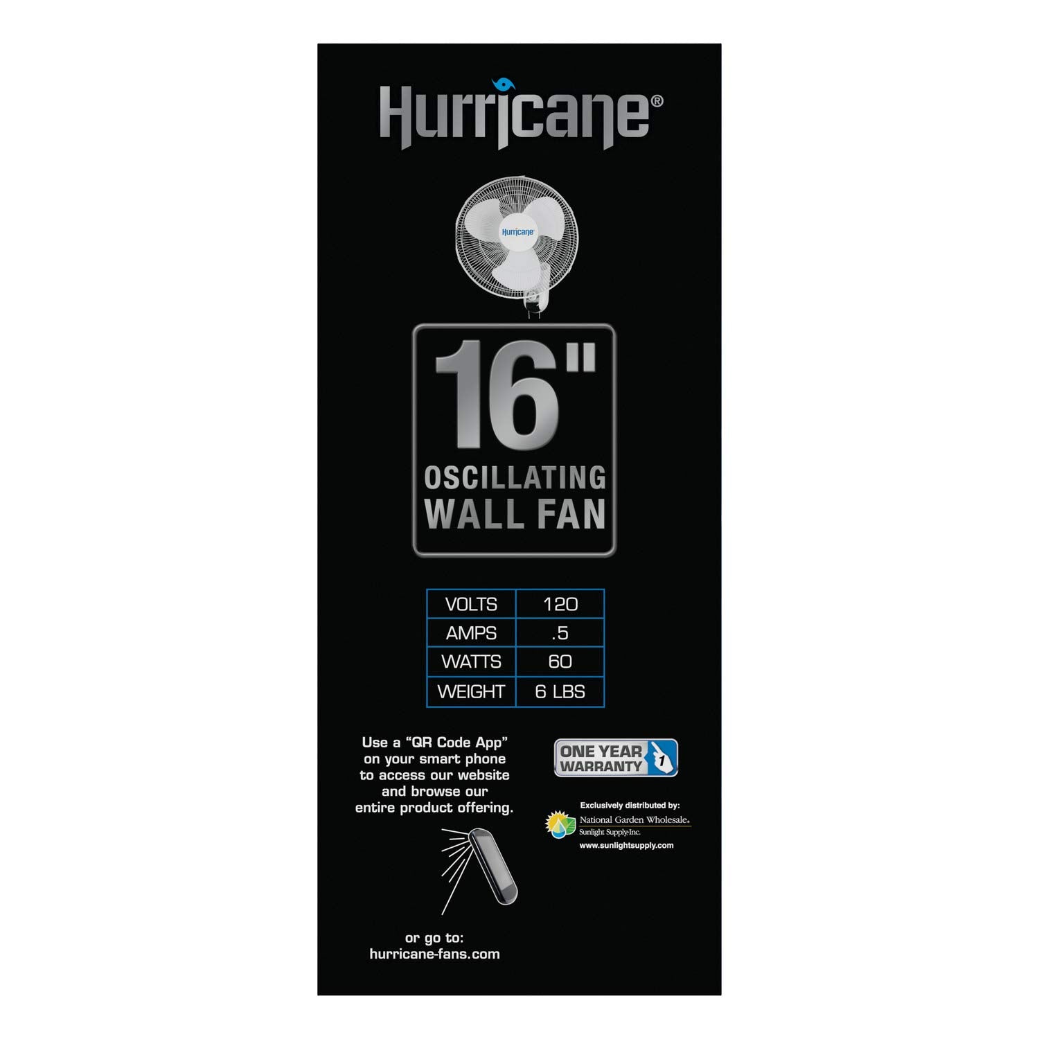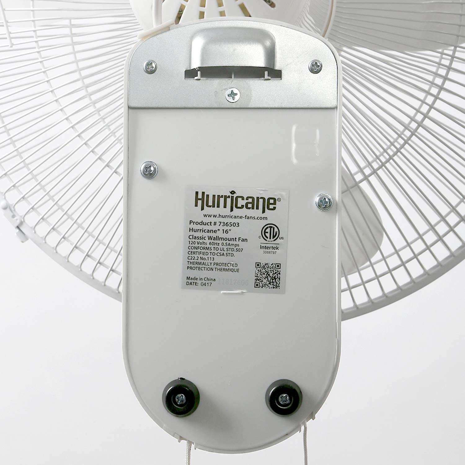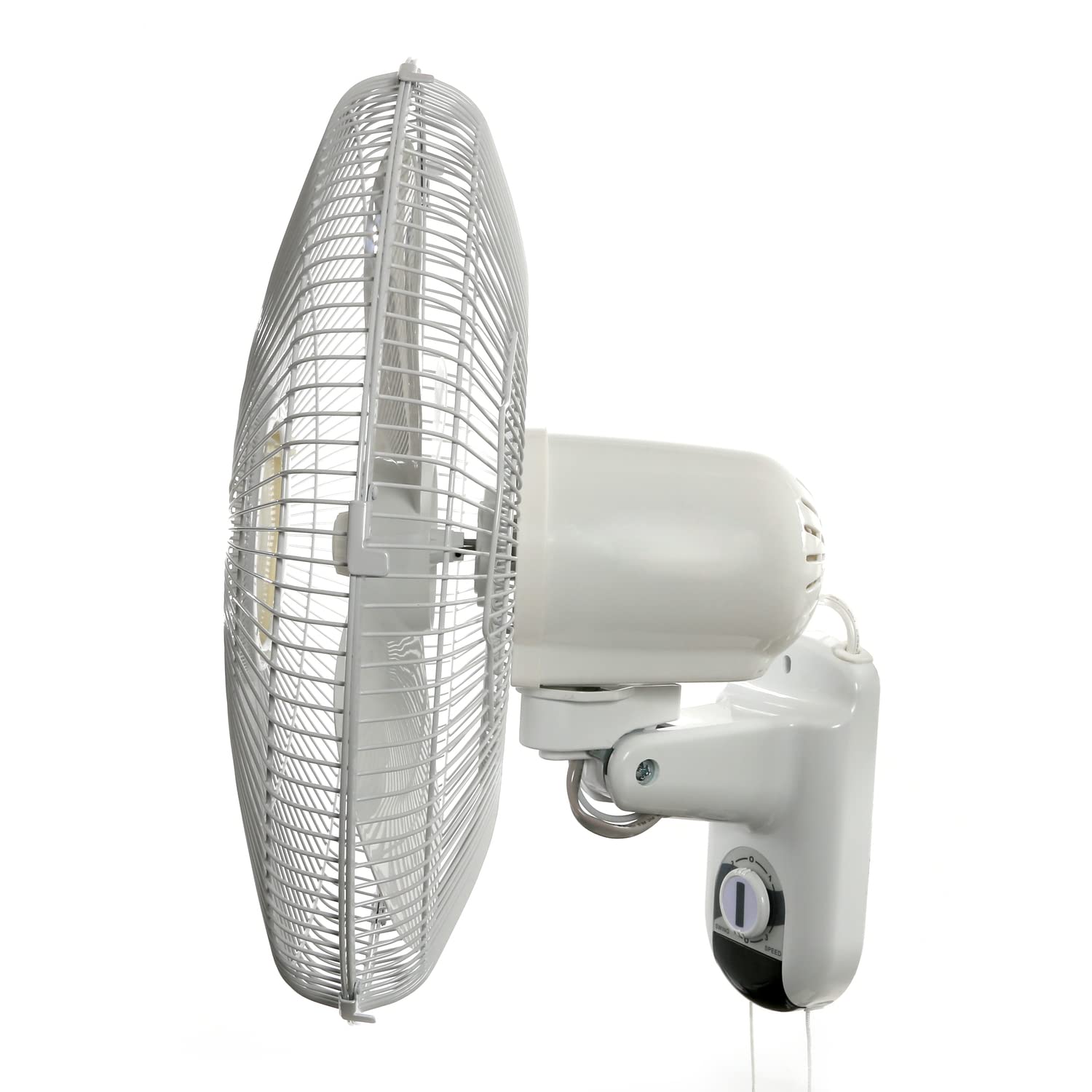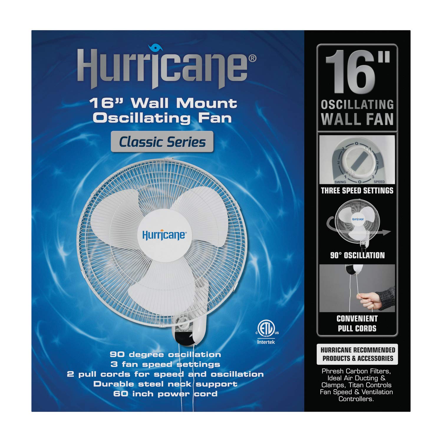 For a cool breeze and steady flow of air you can control—anywhere you need them—turn to the Hurricane Classic 16 inch Wall Mount Oscillating Fan. The 90° oscillation option means side-side-movement reaching wider spaces. Features an option to lock in a static position for limiting airflow to one steady direction. The hanging pull cords mean you can install the fan high on the wall yet still access and control the 3 speed options. This oscillating wall mount fan's quiet, yet powerful motor generates a cooling breeze in areas large and small, without the distracting buzzing or humming. It’s perfect for grow tents, apartments, offices, sheds, home garages, small studios, and dorms. Features a metal fan grill and strong steel neck for support and long-term durability. Comes with a hanging bracket and a 5 ft power cord. ETL listed.