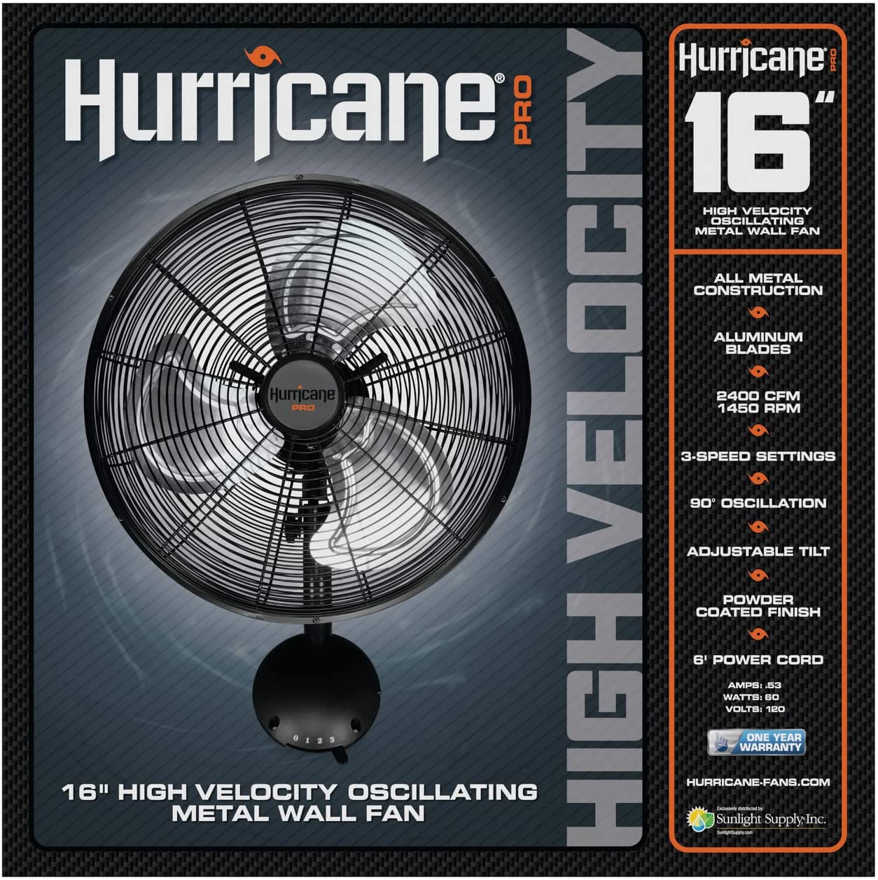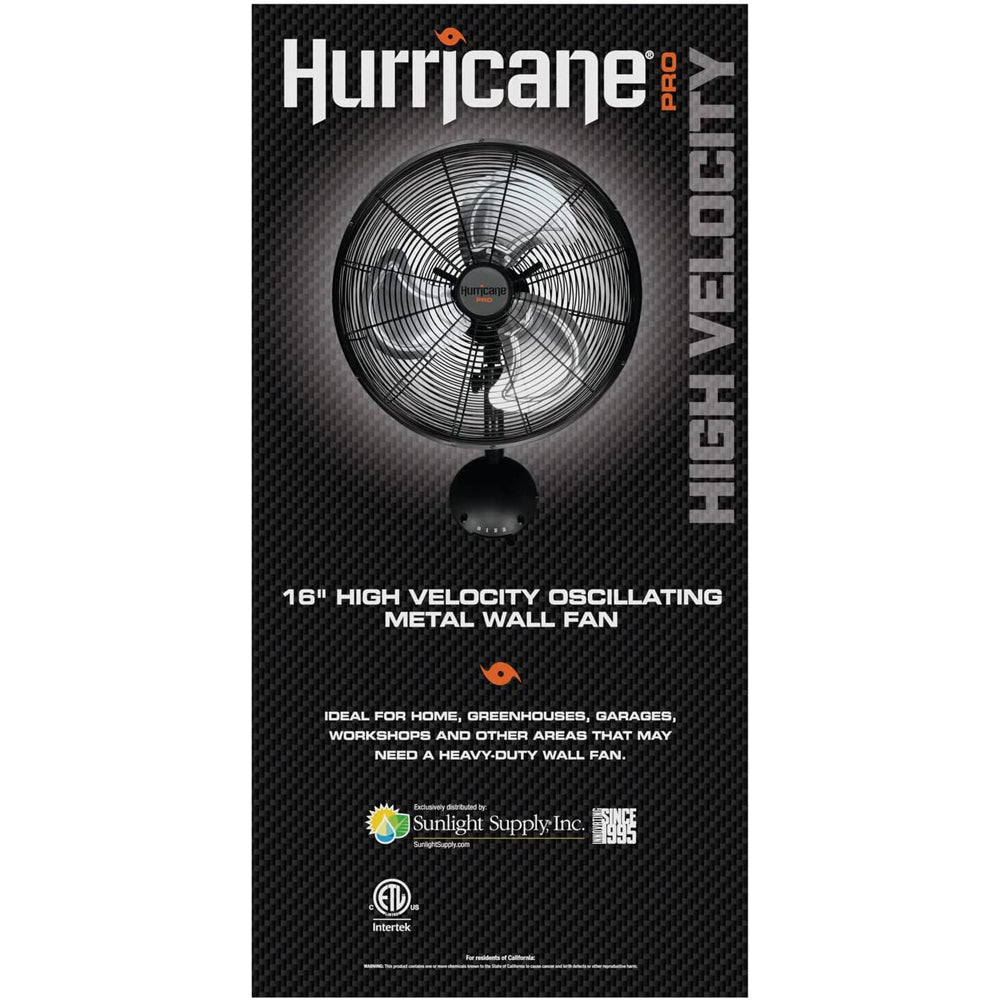 The Hurricane Pro 16 Inch High Velocity Oscillating Metal Wall Mount Fan is a great space saver ideal for homes, greenhouses, garages, gyms, workshops and other areas that require a reliable and steady flow of air. As an industry leader in industrial fans and quality construction, these heavy-duty Hurricane Fans have a rugged all-metal build, with aluminum fan blades and a black powder-coated finish. Its 3 speed settings, oscillation and the adjustable tilt allows you to customize the combination of speed and airflow. It can be easily mounted on a wall with the included heavy-duty wall bracket and hardware. The Hurricane Pro Wall Mount Fan has a thermally protected motor that will automatically shut off before overheating, so you can feel secure about leaving it running day or night. Runs at 1450 RPM with an airflow of 2400 CFM on high. Comes with a 6 ft 120 V power cord. ETL listed.