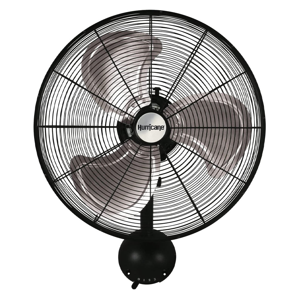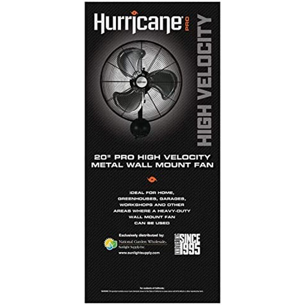 The Hurricane® Pro 20 Inch High Velocity Oscillating Metal Wall Mount Fan is a great space saver ideal for homes, greenhouses, garages, gyms, workshops and other areas that require a reliable and steady flow of air. As an industry leader in industrial fans and quality construction, these heavy-duty Hurricane Fans have a rugged all-metal build, with aluminum fan blades and a black powder-coated finish. Its 3 speed settings, oscillation and the adjustable tilt allows you to customize the combination of speed and airflow. It can be easily mounted on a wall with the included heavy-duty wall bracket and hardware. The Hurricane Pro Wall Mount Fan has a thermally protected motor that will automatically shut off before overheating, so you can feel secure about leaving it running day or night. Runs at 1450 RPM with an airflow of 4500 CFM on high. Comes with a 6 ft 120 V power cord. ETL listed.