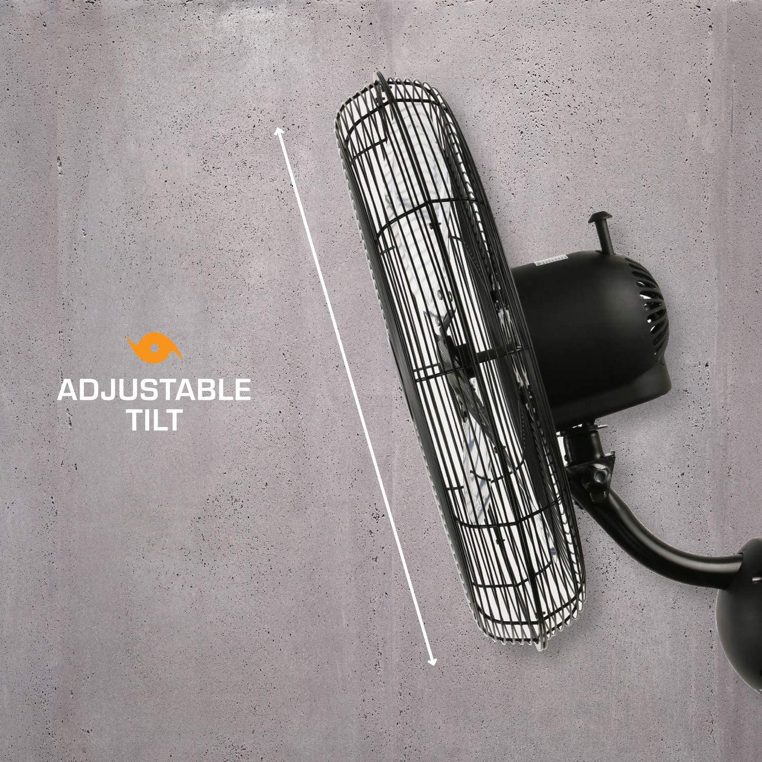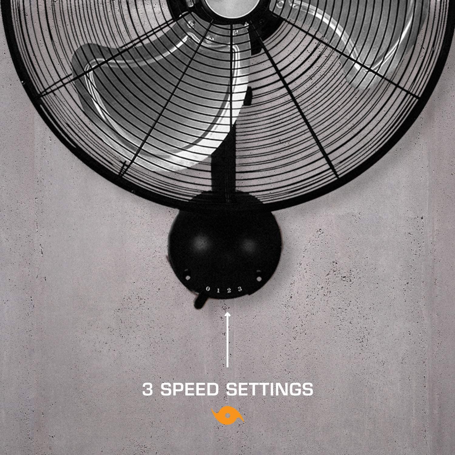 The Hurricane Pro High Velocity Oscillating Metal Wall Mount Fan is designed for rapid air movement, featuring three speed settings and adjustable tilt.