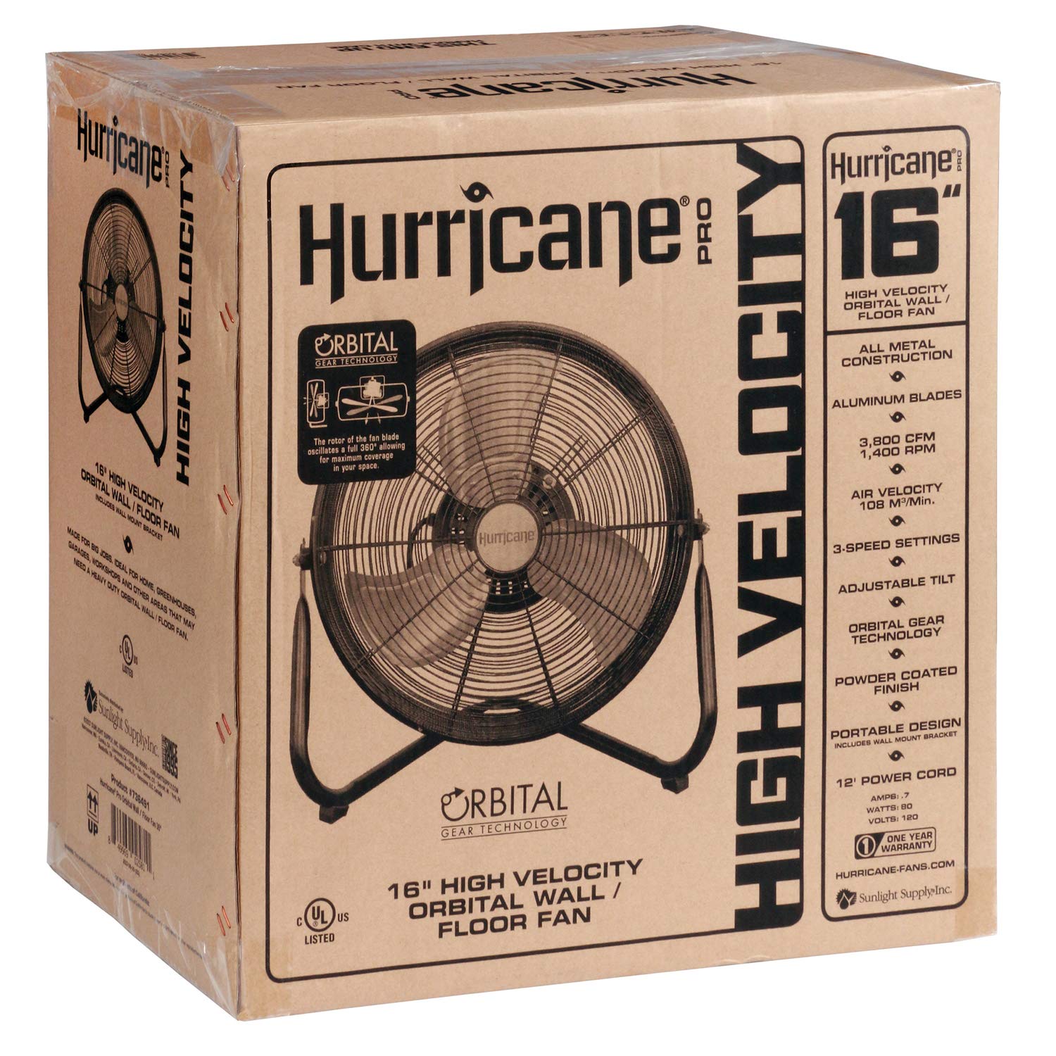 The Hurricane Pro 16 Inch High Velocity Orbital Floor Fan is a portable fan that is compact in size, yet big in performance. As an industry leader in fans, these industrial Hurricane Fans feature all-metal construction, a black powder-coated finish, and aluminum blades. The portable design is compact enough to take up minimal space, yet strong enough to power air throughout homes, garages, greenhouses, gyms, workshops, and other commercial areas that require a controlled and consistent airflow. With orbital gear technology, the rotor of the fan blade oscillates a full 360 degrees, allowing for maximum coverage in your selected space, while the adjustable tilt makes it easy to manage air direction. Hurricane’s 3-speed settings give you the flexibility to control the needs of your space without losing the power of a high-velocity fan. Runs at 3800 CFM and 1400 RPM. Comes with a 5 ft.120 V power cord. UL listed.
