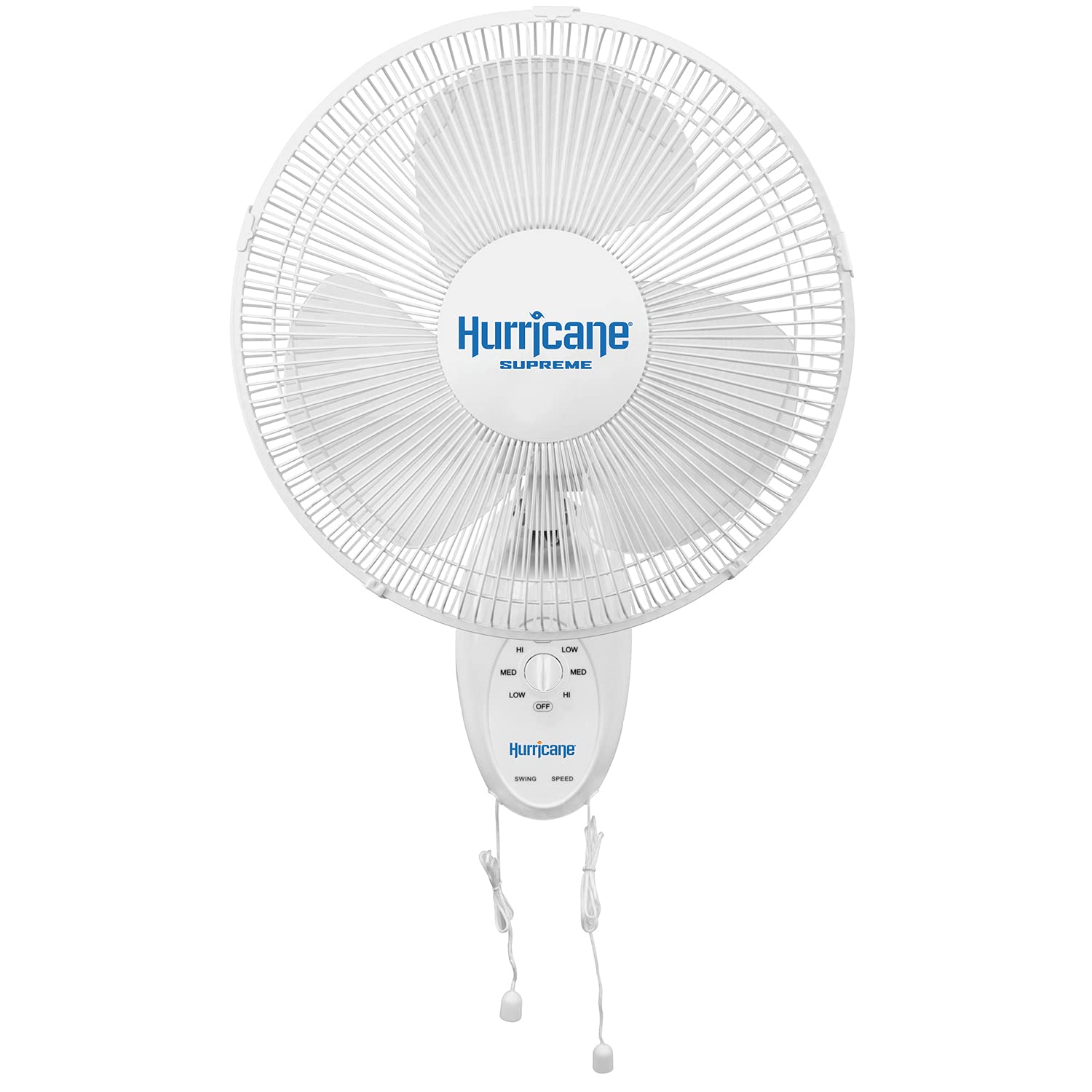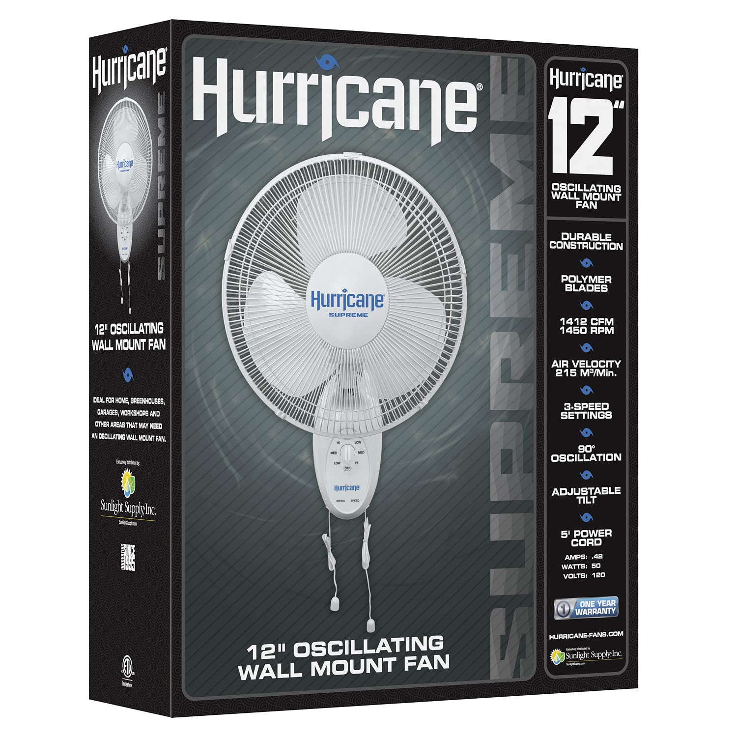 Increase airflow at home or in your workplace without sacrificing floor space with this Hurricane® Supreme 12 inch Oscillating Wall Mount Fan. It's ideal for homes, greenhouses, garages, workshops, gyms and other areas with limited floor space. Control the 3-speed optional settings with its low hanging pull cords, or with the turn dial. The wall fan's quiet, yet powerful motor will generate all the airflow you want, without the noise. The fan 90° side-to-side oscillation and adjustable tilt make it easy to change direction. Fan may also be locked in a non-oscillating position. As an industry leader in fans, these wall mount Hurricane Fans feature chemical resistant polypropylene blades, a powder-coated steel grill and a steel support neck to ensure long-lasting durability in almost any environment—damp or dry. Great output with 1450 RPM and airflow of 1412 CFM on high. Comes with a 5-foot power cord. ETL Listed. Hanging bracket included.
