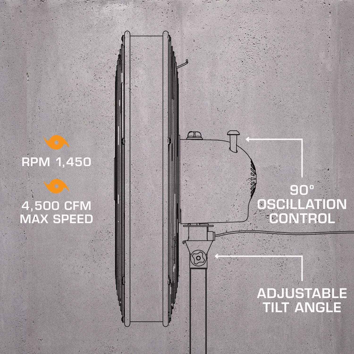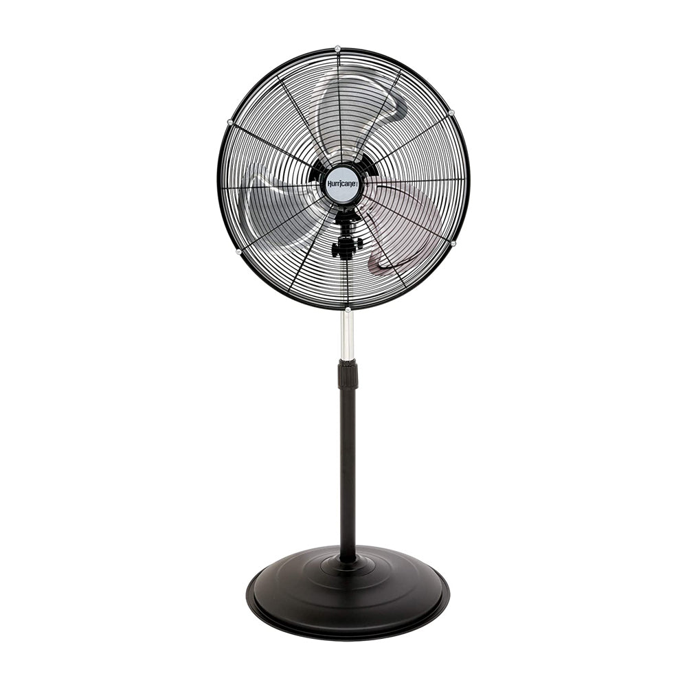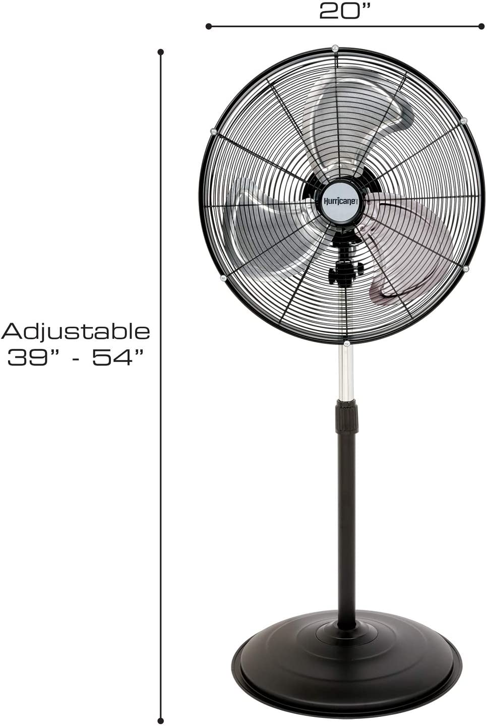 The Hurricane® Pro 20 inch High Velocity Oscillating Metal Stand Fan is made to last for many seasons. This high-speed fan is ideal for homes, greenhouses, garages, workshops and other areas where a heavy-duty portable stand fan can be used for a reliable and steady flow of air. As an industry leader in industrial fans and quality construction, these heavy-duty Hurricane Fans have a rugged all-metal build, with heavy-duty aluminum fan blades and a black powder-coated finish. Its 3 speed settings, oscillation and adjustable tilt allow you to customize the combination of speed and airflow for ideal ventilation in any space. It has an adjustable height from 39 inches up to 54 inches tall with a round sturdy weighted base to help your fan remain securely upright. Runs at 1450 RPM with an airflow of 4500 CFM on high. Comes with a 6 ft 120 V power cord. ETL listed.